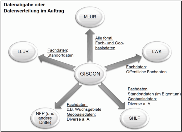 Zur Zeit bildet GISCON geo.engineering.gmbh die externe Geodatenkopfstelle des Fachbereichs Forst am MLUR. Hier erfolgt einerseits die Datenzulieferung / Datenerstellung sowie Datenabgabe oder -verteilung für verschiedene Behörden in Schleswig-Holstein sowie berechtigte Dritte (u.a. NFP, Nordwestdeutsche Versuchsanstalt).